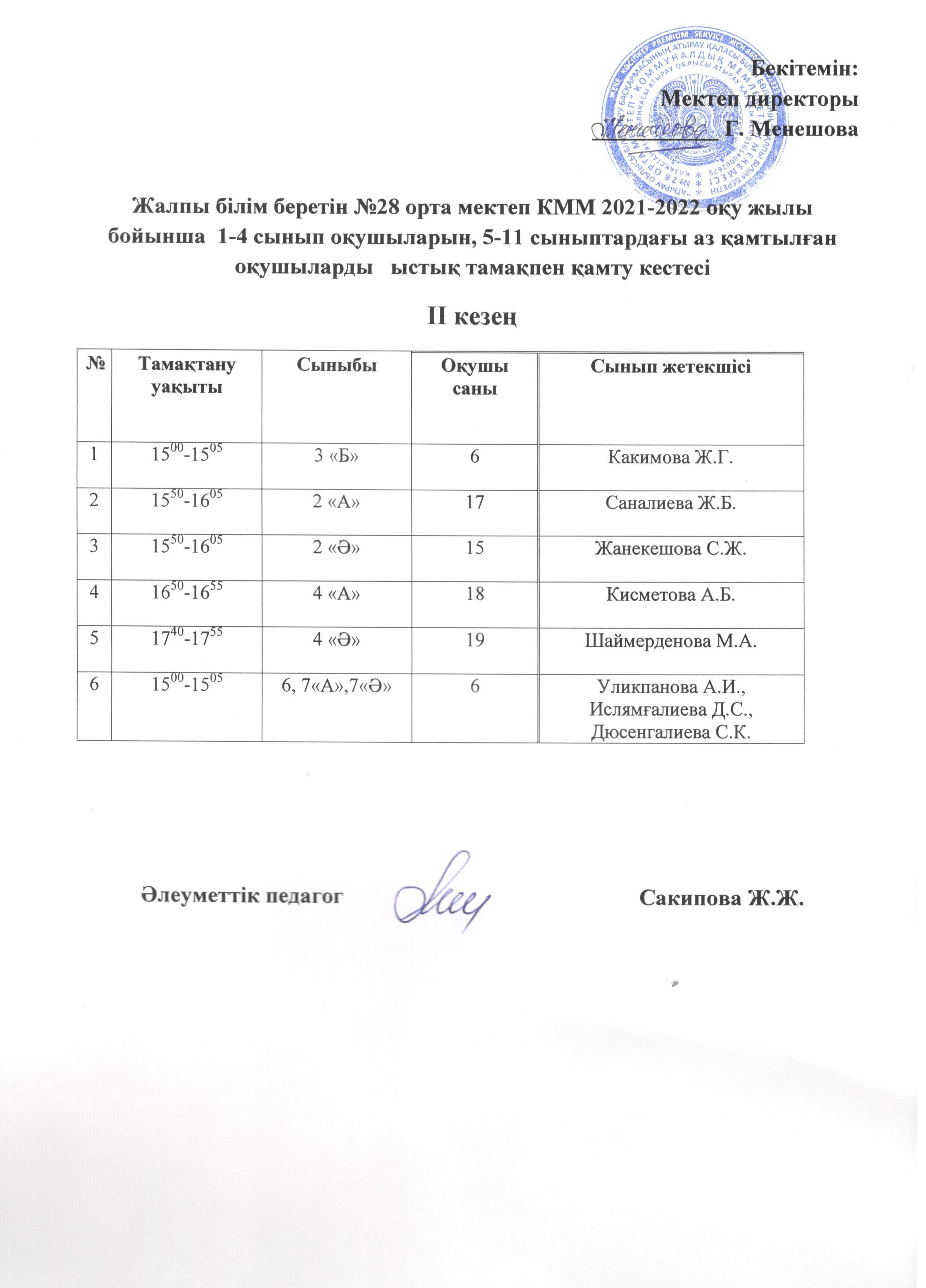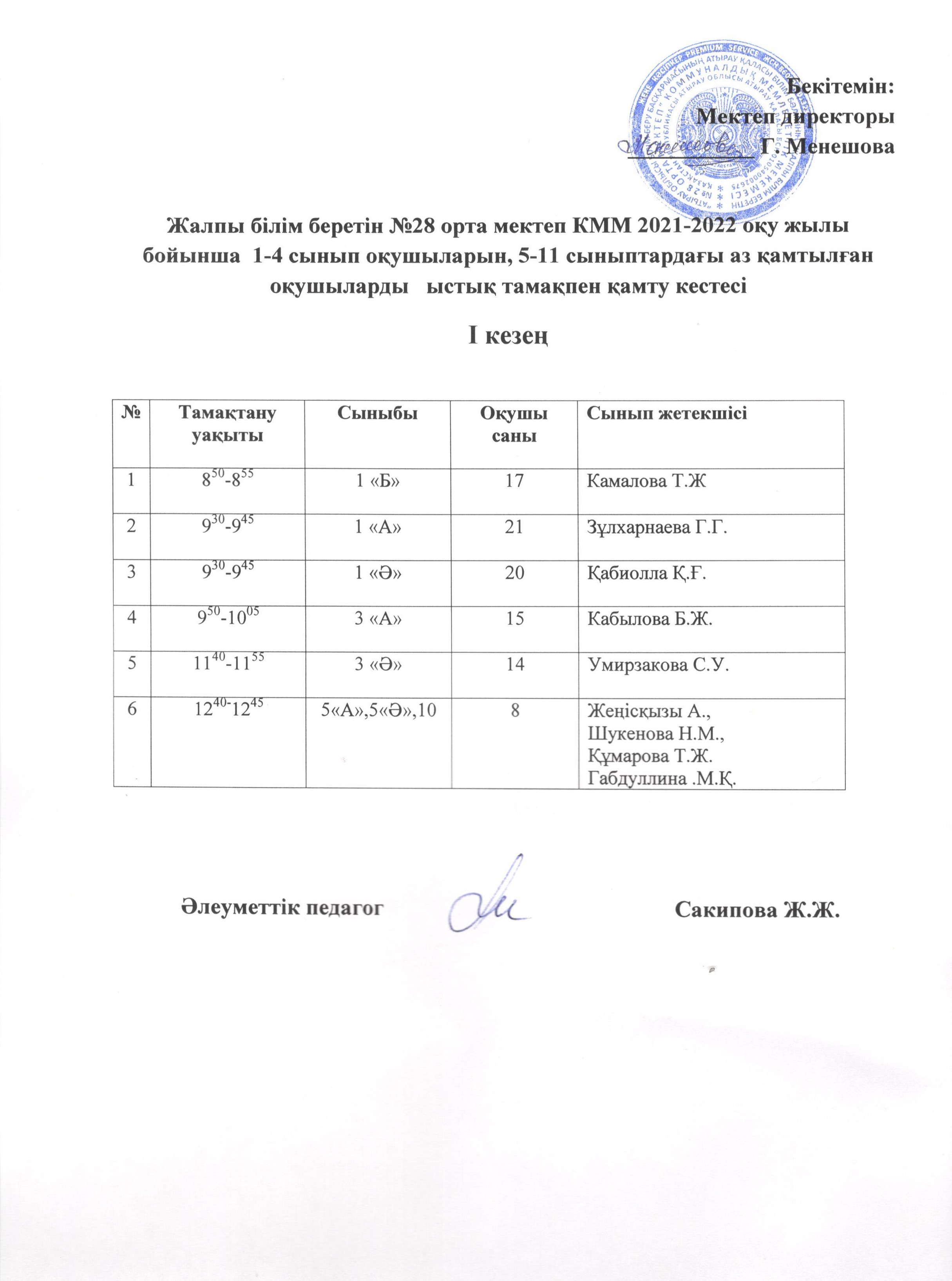 2021-2022 оқу жылы бойынша 1-4 сынып оқушыларын, 5-11 сыныптардағы өз қамтылған оқушыларды ыстық тамақпен қамту кестесі