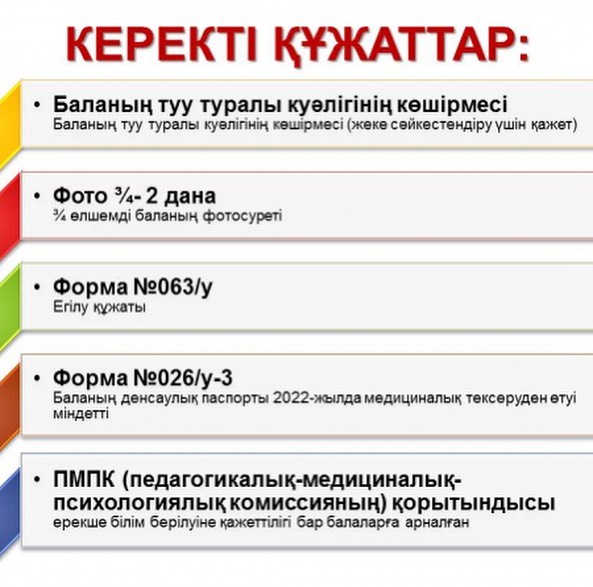 Бірінші сынып оқушыларының құжаттарын қабылдау 1 сәуірде басталып, 1 тамызға дейін жалғасады. Құжаттарды egov.kz арқылы беруге болады:
