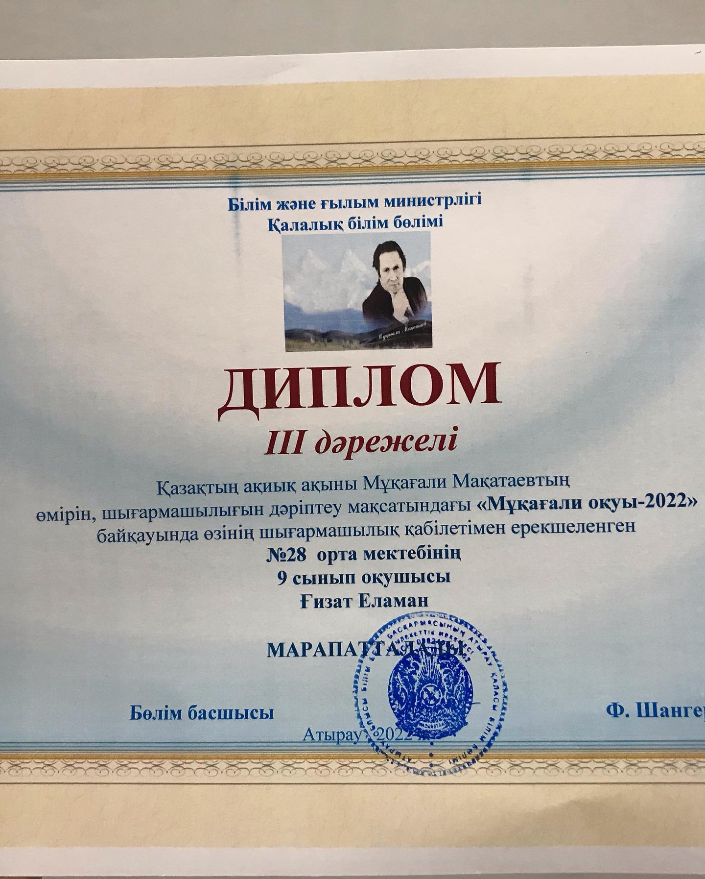 Жалпы білім беретін №28 орта мектептің 9 А сынып оқушысы Ғизат Еламан Қалалық «Мұқағали оқуларынан» ІІІ-орынға ие болды.